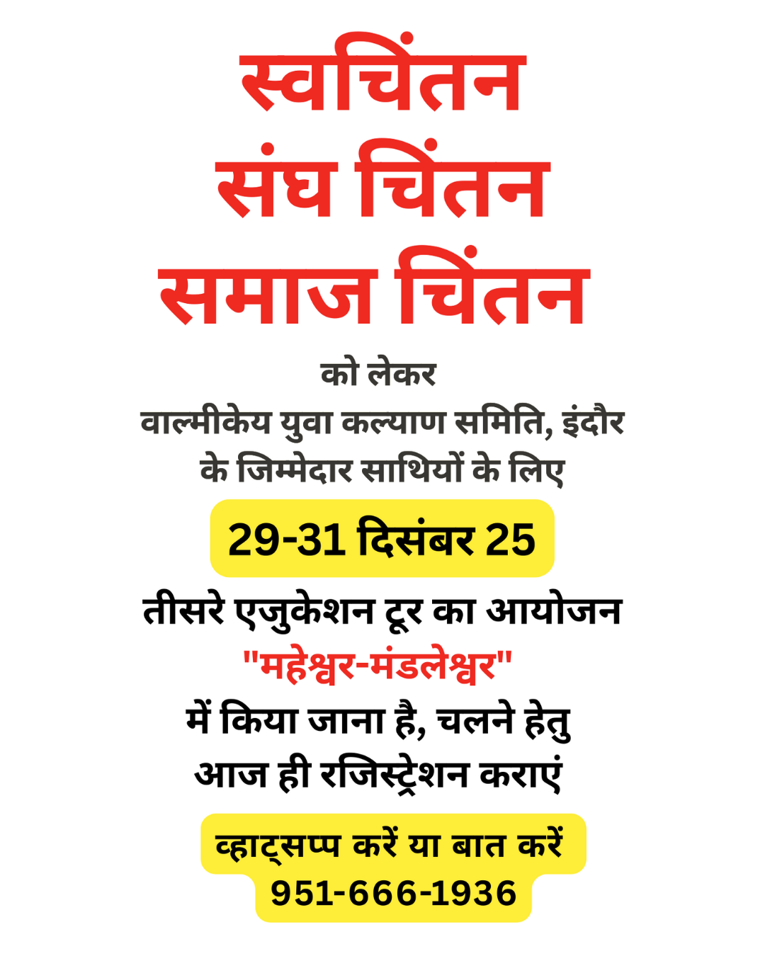 यह आयोजन आत्मसम्मान, अधिकार-बोध और भविष्य की दिशा तय करने का प्रयास है—जहाँ युवा सिर्फ श्रोता नहीं, बल्कि परिवर्तन के वाहक बनते हैं। वाल्मीकेय युवा कल्याण समिति का यह सतत प्रयास बताता है कि जब संवाद सशक्त होता है, तब समाज भी सशक्त होता है।